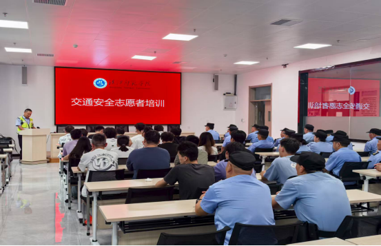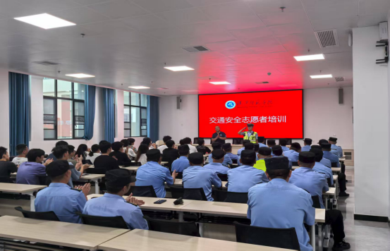 培训会上,贾警官为学生志愿者和学校的安保人员带了一场干货满满的交通安全常识宣讲。通过生动案例与详细讲解,大家系统学习了校园道路安全知识,对如何引导行人、非机动车安全通行有了清晰认识。